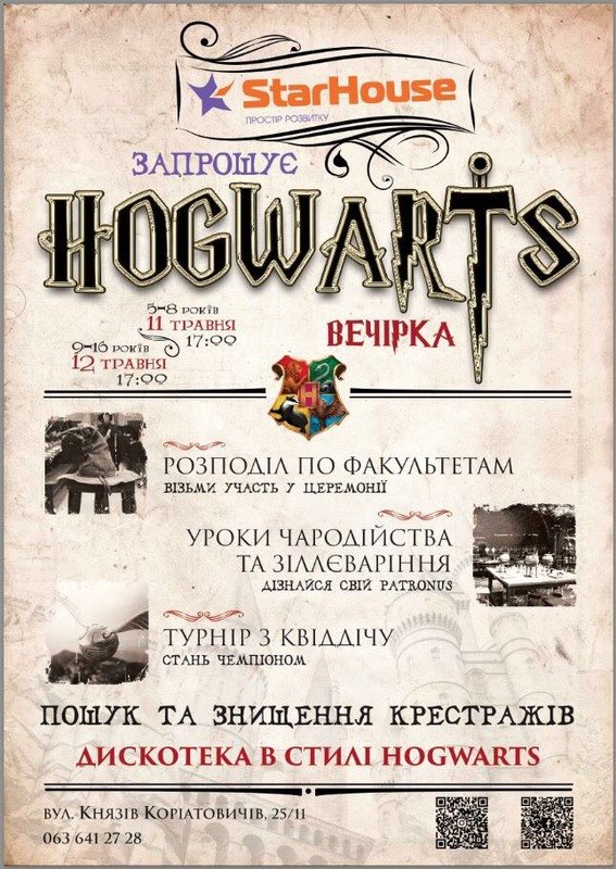 Wingardium leviosa! Підлітаємо на найочікуванішу вечірку в стилі фільму Гаррі Поттер! Напевно всі у дитинстві мріяли отримати листа з Школи Магії Hogwarts. І цієї весни у Вас є нагода! Запрошуємо юних чародіїв відвідати уроки магії, зіграти у квідіч, знайти крестражі та побувати на справжній Чародійській дискотеці.