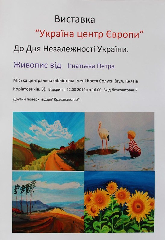 Запрошую Всіх на відкриття виставки "Україна центр Європи" до Дня Незалежності України. Живопис від Ігнатьєва Петра. 22.08 о 16:00 у центральній міській бібліотеці імені Костя Солухи, другий поверх відділ "Краєзнавства". Виставка буде експонуватись до 22.09.