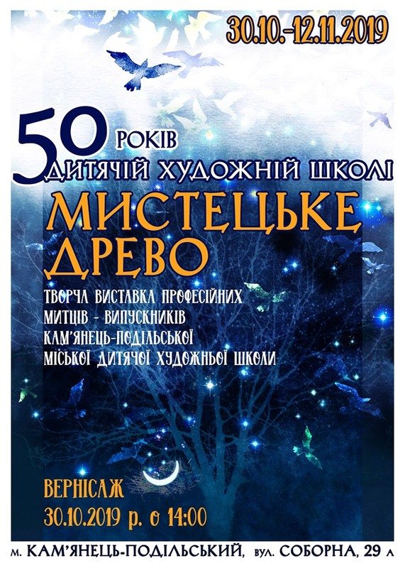 Колектив художньої школи радо запрошує випускників всіх років, учнів, колег-художників, всіх дотичних до життя і історії нашої школи на вернісаж виставки "Мистецьке древо". Виставка триватиме з 30.10-16.11.2019 р. Урочисте відкриття - ВХІД БЕЗКОШТОВНИЙ.