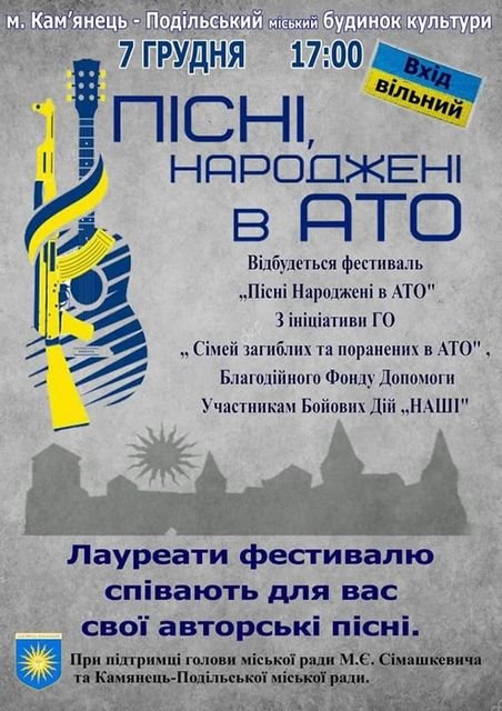 7 грудня о 17:00 в міському Будинку культури відбудеться черговий фестиваль авторської пісні "Пісні, народжені в АТО".