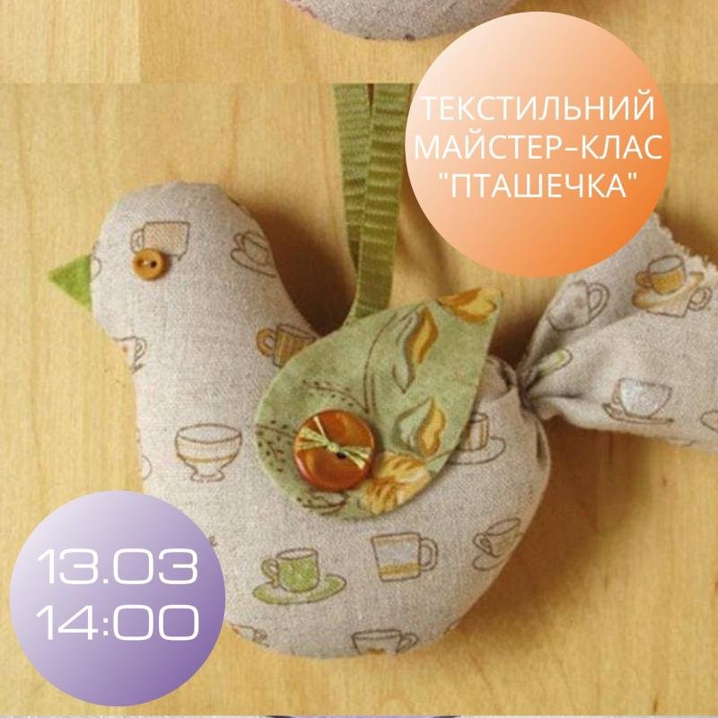 Запрошуємо дітей на майстер-класи цього тижня! Субота 13.03 "Пташечка" майстер-клас з пошиття чудової текстильної пташечки. Початок: 14:00. Вартість: 90 грн. Велике прохання записуватись для того, щоб ми мали можливість розрахувати необхідну кількість матеріалів та дотриматись карантинних вимог щодо кількості осіб на майстер-класі. Дякуємо! Запис за телефонами: +380(63) 641-27-28; +380(98)501-16-15/Viber або у приватних повідомленнях.
