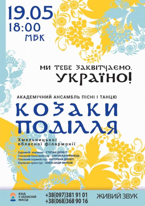 Кам'янець-Подільський, МБК 19 травня, середа, початок о 18:00 академічний ансамбль пісні і танцю "Козаки Поділля" запрошує всіх кам'янчан та гостей міста на концерт "Ми тебе заквітчаємо, Україно"!