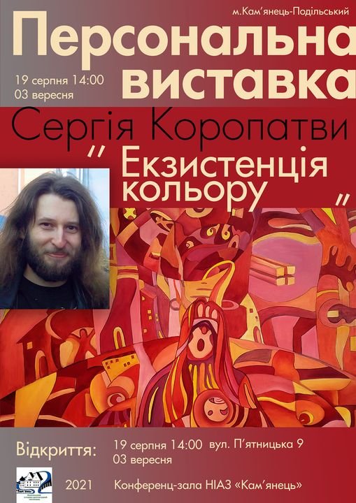 19 серпня о 14:00 всіх охочих запрошуємо відвідати першу персональну виставку Сергія Коропатви - "Екзистенція кольору", яка буде відкрита у конференц-залі НІАЗ "Кам'янець" вул. П'ятницька, 9 до 03 вересня.
