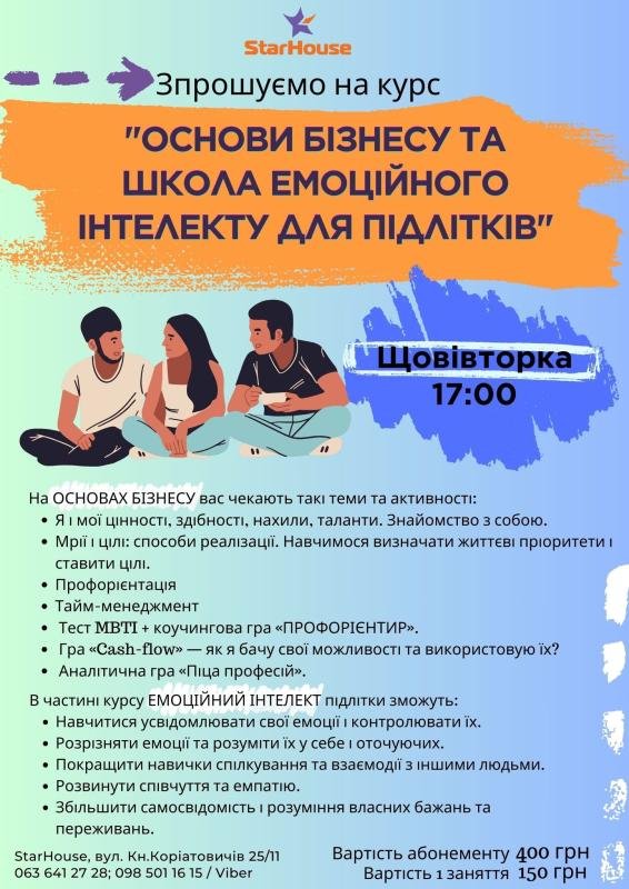Запрошуємо підлітків до захоплюючої подорожі у світ бізнесу та емоційного інтелекту! Реєстрація за посиланням https://forms.gle/bsR1hHvfZHrfpoF89.