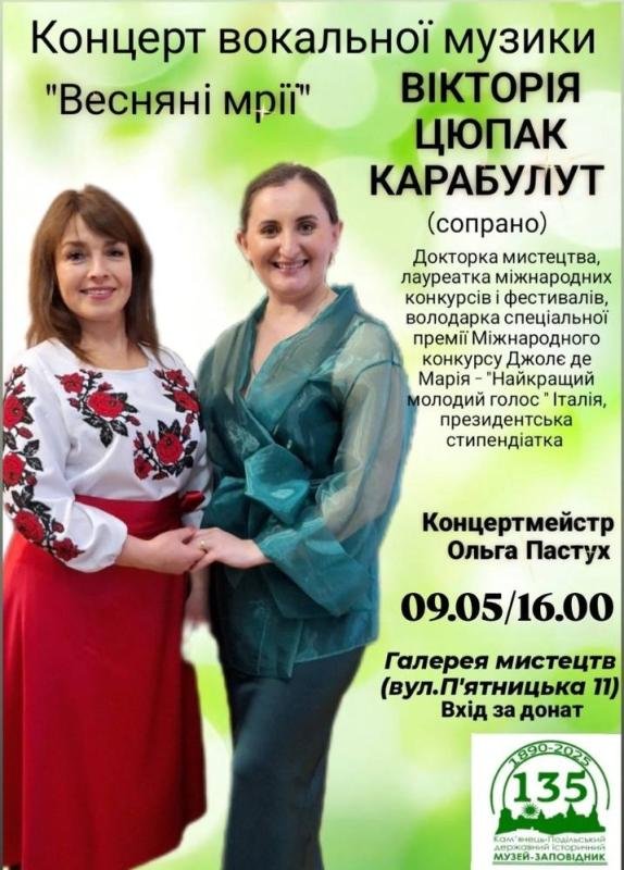 09.05.2025 - концерт вокальної музики "Весняні мрії" Вікторії Цюпак-Карабулут, докторка мистецтва, лауреатка міжнародних конкурсів і фестивалів володарка спеціальної премії Міжнародного конкурсу Джолє де Марія "Найкращий молодий голос" Італія, президентська стипендіатка, Галерея мистецтв.