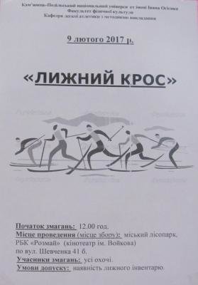 Запрошуємо всіх охочих взяти участь у змаганні “Лижний крос”, яке відбудеться 9 лютого о 12:00 год., місце проведення: міський лісопарк, РБК “Розмай” (кінотеатр імені Войкова) по вул. Шевченка 41 б