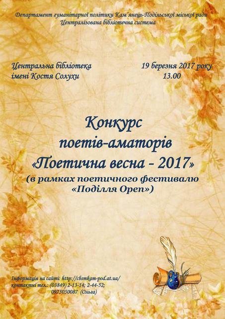 19 березня в центральній бібліотеці ім. Костя Солухи пройде конкурс поетів-аматорів «Поетична весна».