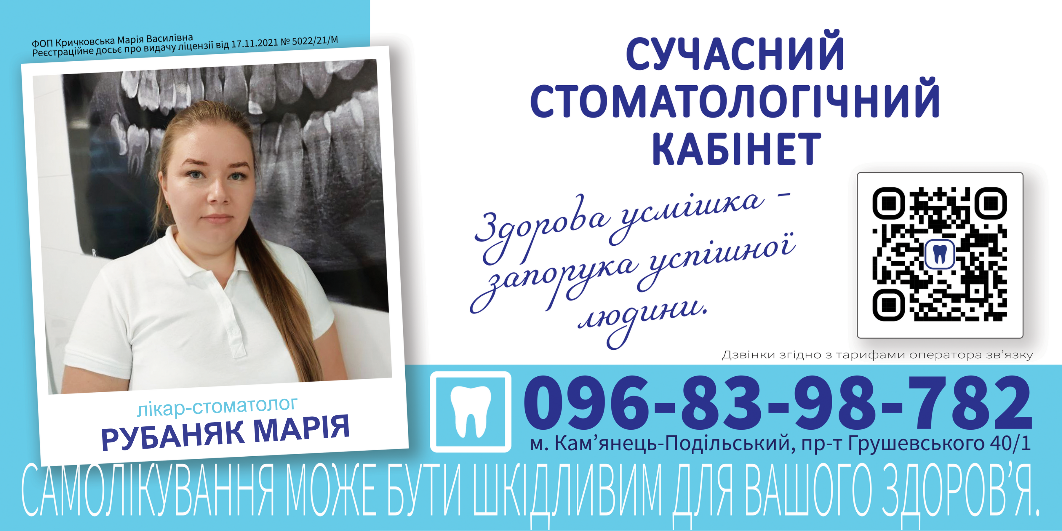 Стоматологія "Meri Dent" Рубаняк (Кричковської) Марії Василівни, що розташований за адресою м. Кам’янець-Подільський, проспект Грушевського, 40 - це стоматологія, яка завдяки професійній роботі досвідченого та кваліфікованого спеціаліста, забезпечила собі довіру та повагу пацієнтів.