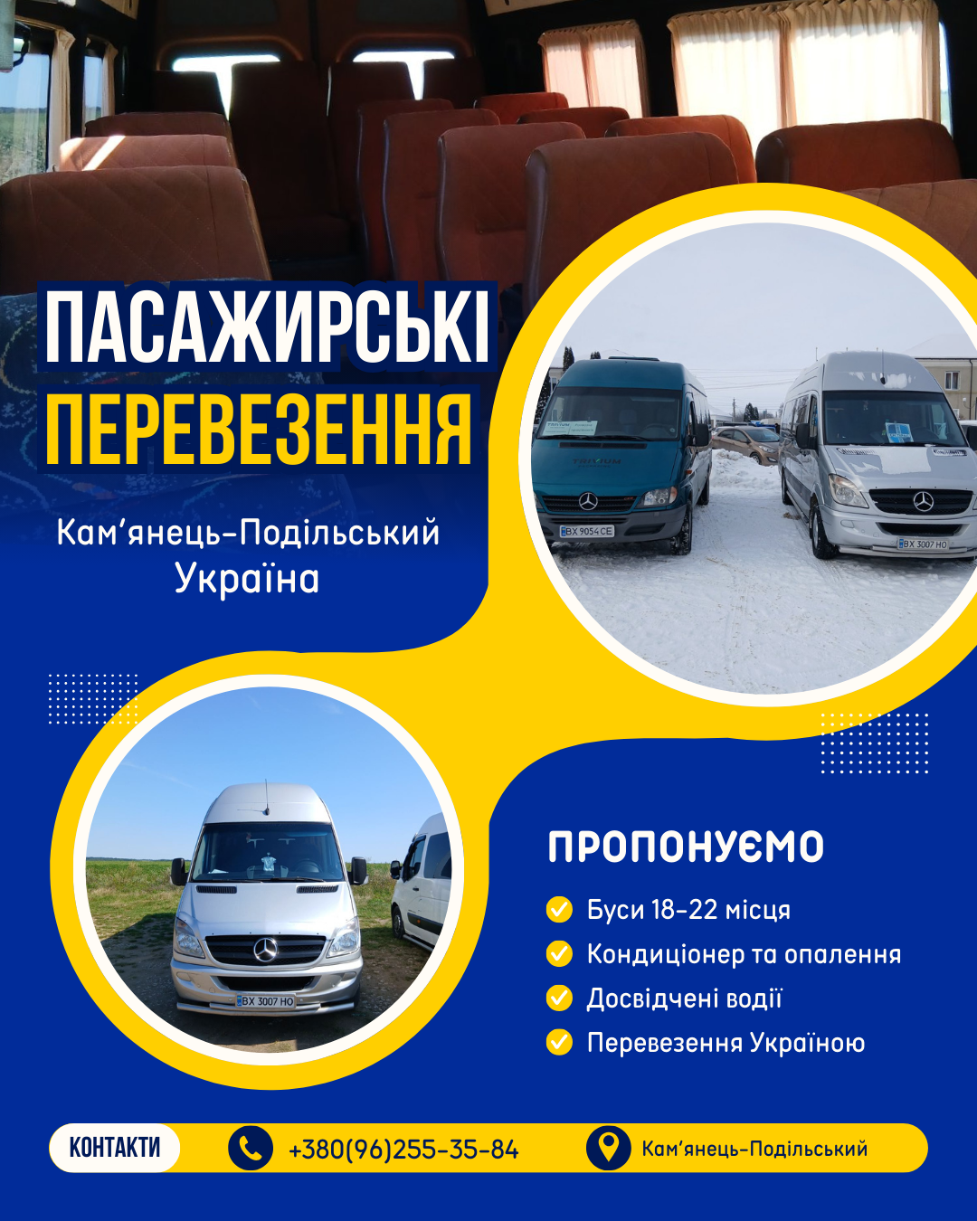 Пасажирські перевезення здійснюють досвідчені водії з багаторічним стажем роботи, які добре орієнтуються на дорогах Кам’янця-Подільського, Хмельницької області та всієї України. Професіоналізм, відповідальність і ввічливе ставлення до клієнтів гарантують спокійну та приємну подорож без зайвих клопотів.