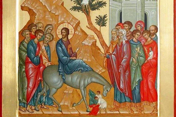 Між тим в Єрусалимі дізнались, що Іісус, Який воскресив Лазаря, йде до міста. Велика кількість народу, яка зібралася звідусіль на свято Пасхи, вийшла до Нього назустріч. Вони знімали з себе верхній одяг і стелили Господу по дорозі; інші зрізали віття пальм, несли їх в руках і кидали перед Ним. І весь народ: і той, який супроводжував Господа, і той, який зустрічав, радісно вигукував: "Осанна (спасіння) Сину Давидову! Благословенний, Хто йде в ім’я Господнє (достойний хвали, той, хто йде від імені Господа, посланий від Бога), Цар Ізраїля!".