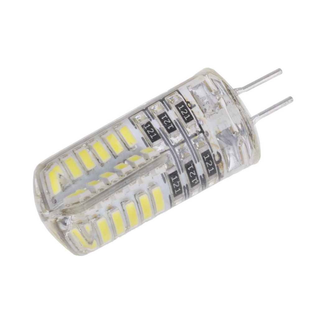 Как было отмечено ранее, самый важный параметр таких моделей – их габариты. Большинство изделий не превышает 3,5 см, а самые крупные (и при этом самые редкие) виды доходят до 5,5 см. Для сравнения: простая лампа накаливания или светодиодная модель обычного форм-фактора имеют длину от восьми до десяти сантиметров. Колба в данном случае не сферическая, а продолговатая, и занимает она порой около 80-85% от общей длины диодной лампы G4. Изделие имеет равномерный диаметр – ни на одном из концов нет существенных утолщений, и даже цокольная часть выдерживается в общих рамках от 1,1 до 1,7 см. Порой встречаются несколько уплощённые, как бы немного приплюснутые модели, у которых только две условно плоских стороны считаются рабочими.