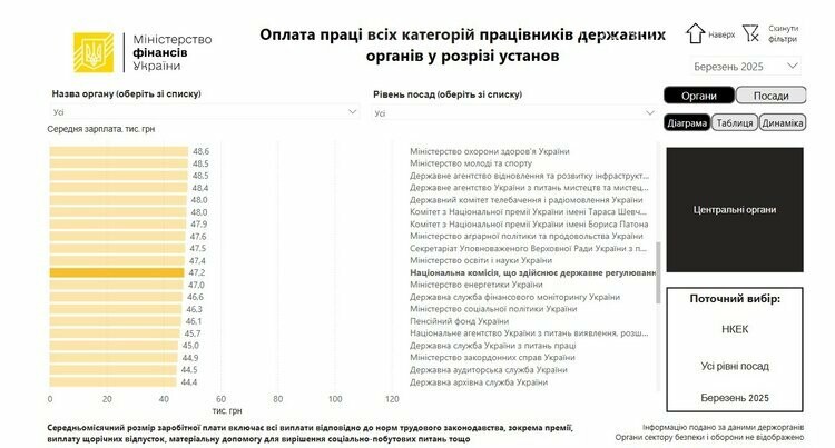 У березні 2025 року середня зарплата становила 47,2 тис. грн. Якщо порівняти з іншими держструктурами, НКЕК далеко не на останньому місці рейтингу зарплат.