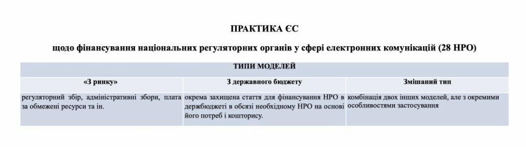 «Наразі кращою практикою та найрозповсюдженішим типом фінансування у сфері електронних комунікацій у ЄС є автономна модель фінансування – незалежне (позабюджетне) фінансування (так зване фінансування з ринку). Така модель надає можливість уникати обмеження фінансових ресурсів і будь-яких інших видів зовнішнього втручання в автономію та фінансову незалежність із боку інших державних органів», – аргументують свою позицію в НКЕК.