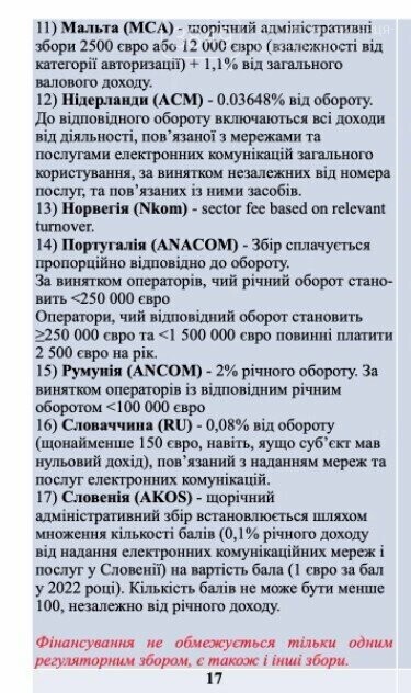 «Фінансування регуляторів у ЄС головним чином відбувається за рахунок ліцензійних платежів, платежів за радіочастотний і номерний ресурси, надання послуг операторам і держбюджету. Натомість у проєкті закону жодне з таких джерел фінансування не передбачається, а пропонується встановити фінансування лише і виключно як «податок». Бо й нарахування внеску, аналогічно нарахуванню податків, запропоновано із загального доходу», – йдеться в іншому листі ІнАУ до НКЕК.
