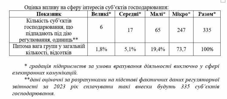 Всього на телеком-ринку працює близько 4000 суб’єктів господарювання. За попередніми підрахунками регулятора, платити внесок мають 335 гравців, серед яких 247 мікропідприємств і 65 малих компаній.