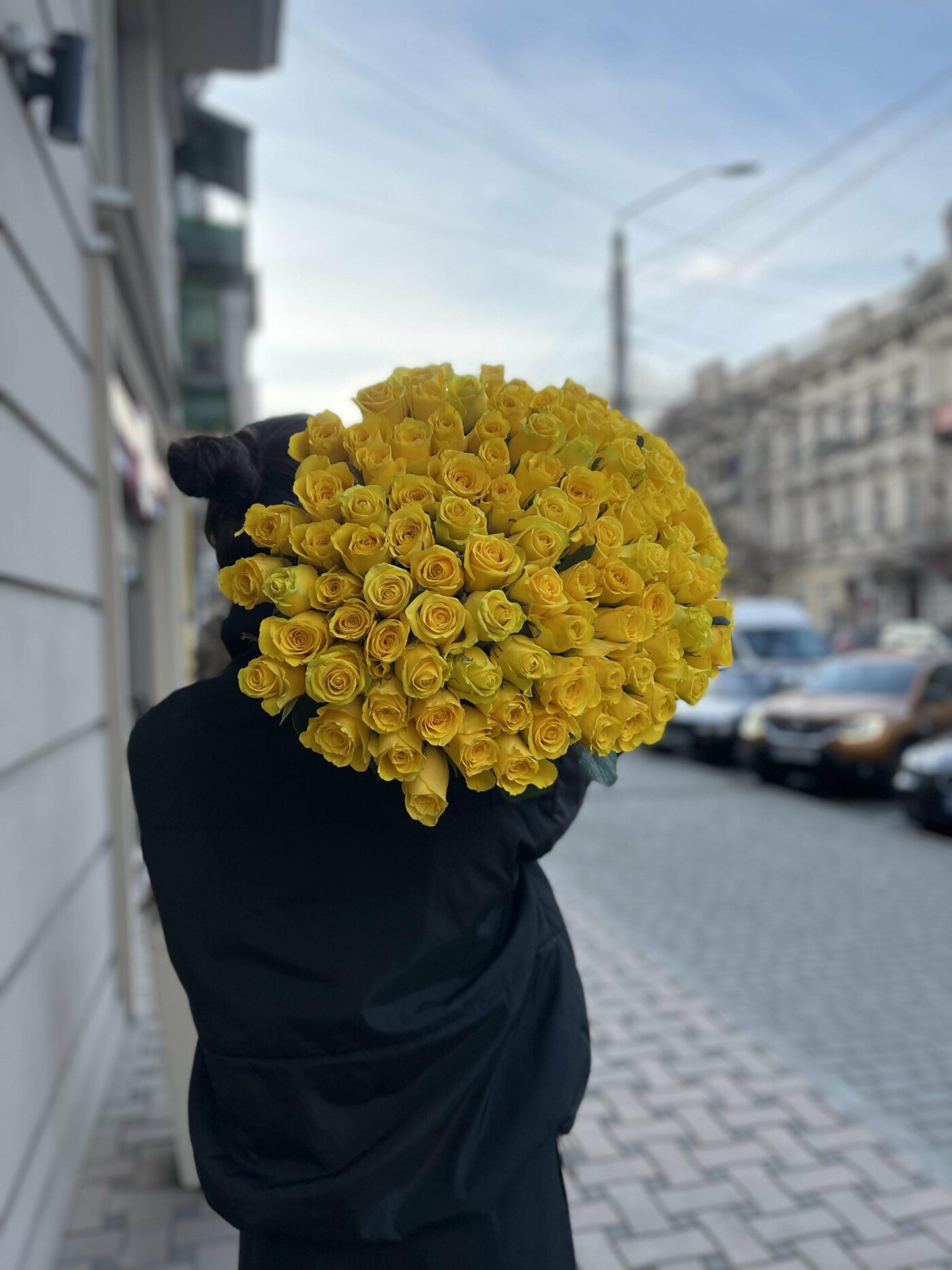 У каталозі Flowers.ua можна знайти як мінімалістичні, так і пишні композиції з 25, 51 або 101 жовтої троянди.